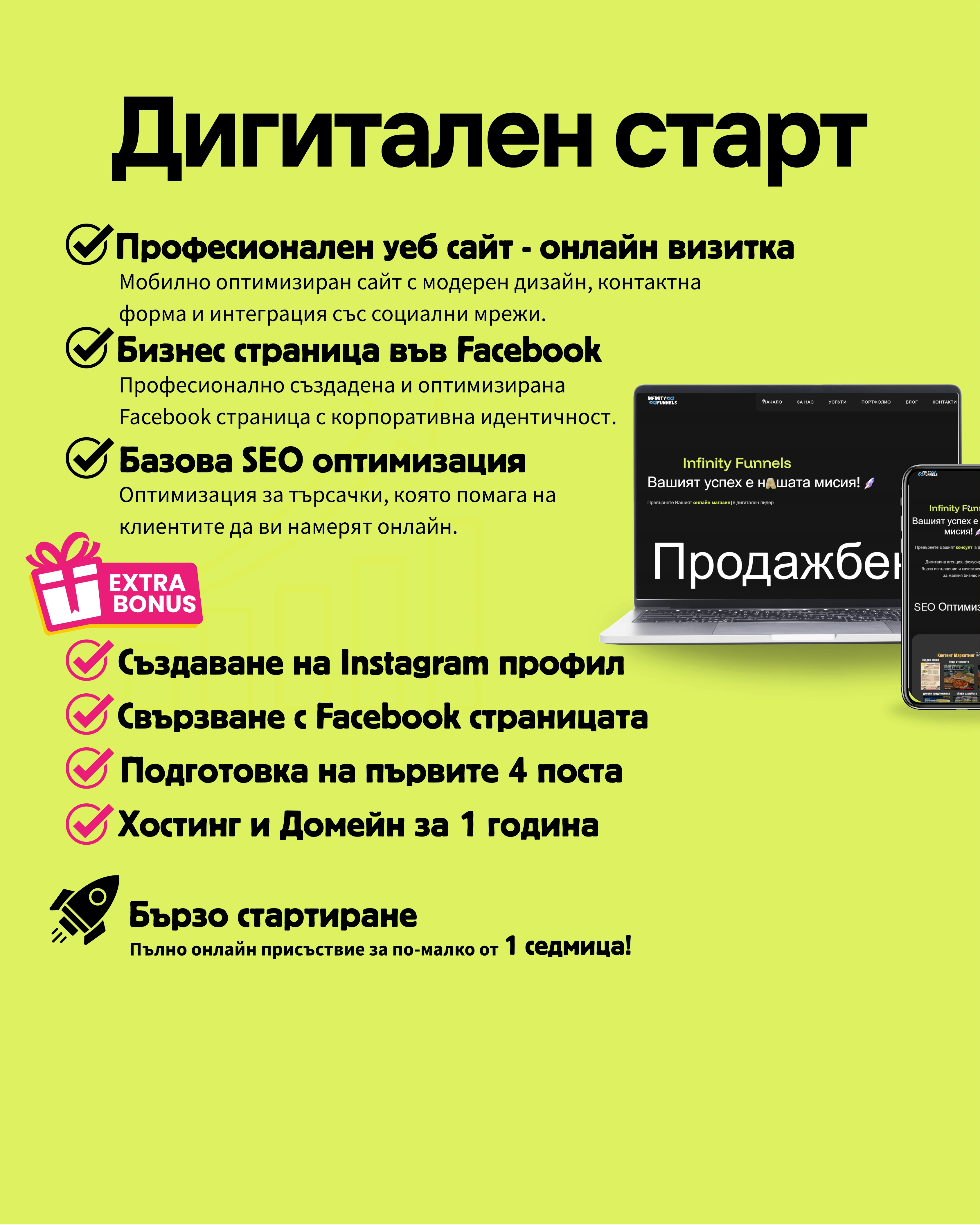 Стартирайте онлайн бързо и професионално. Включва модерен уеб сайт, оптимизирани Facebook и Instagram профили, SEO настройка, хостинг и домейн. Пълното решение за малкия бизнес, който иска силно дигитално присъствие от първия ден. Само 450лв/229.95€ – плащате веднъж, ползвате цяла година!
